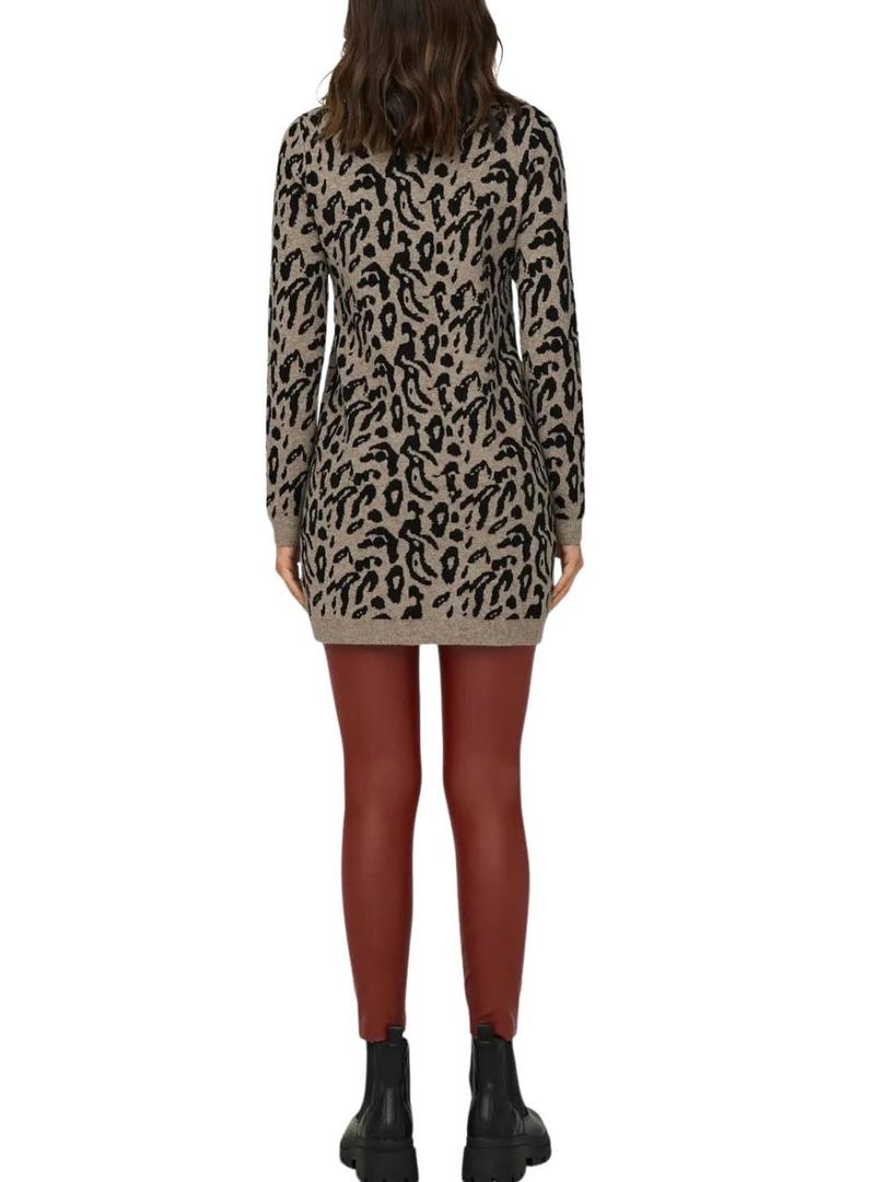 Vestido de malha Only. Modelo Onljenni. Cor marrom. Gola redonda. Manga comprida. Comprimento curto. Corte regular. Estampa animal print. Acabamentos em canelado.