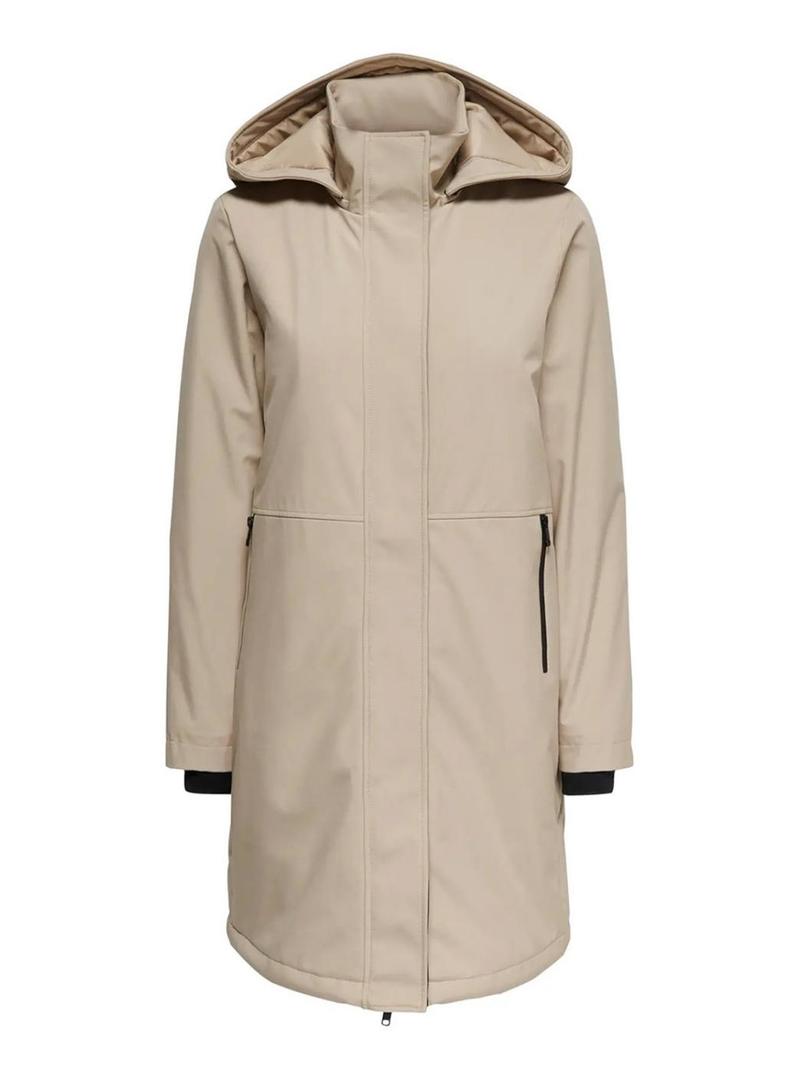 Parka Only. Modelo Kara. Cor bege. Manga comprida. Capuz removível. Punhos elásticos. Fecho com botões de pressão e zíper. Acolchoado de poliéster reciclado. Bolsos laterais com zíper. Corte: longo.