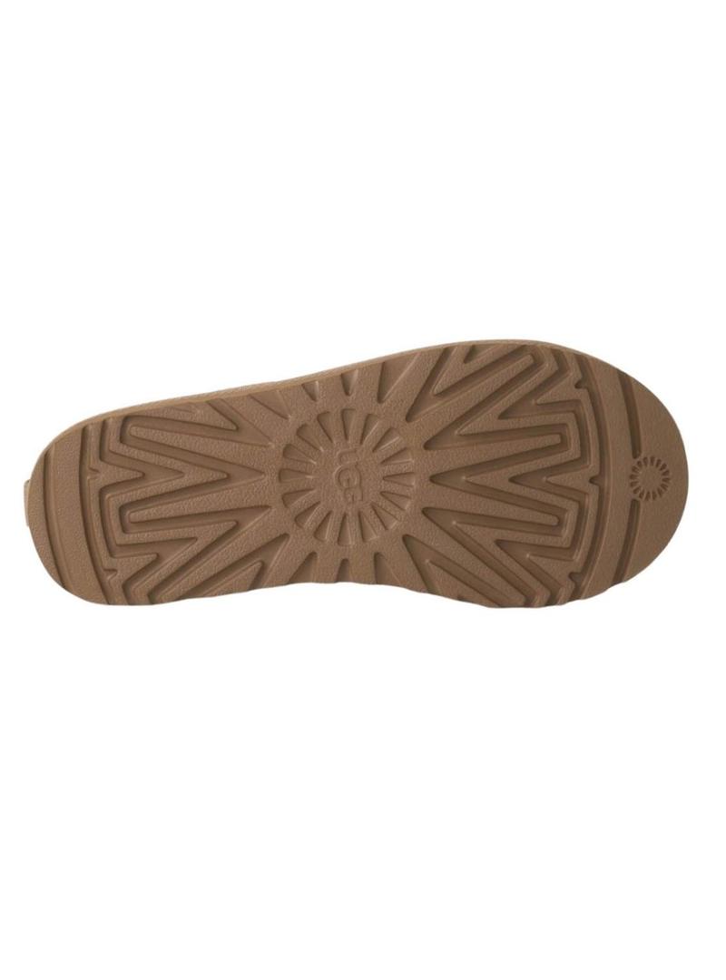 Botas UGG. Modelo Classic Micro. Cor bege claro. Perfil baixo. Parte superior em camurça autêntica tratada hidrofugamente ou resistente à água. Forro de pele de carneiro de 10 mm na canela e 17 mm na parte superior e palmilha para maior conforto e regulação natural da temperatura. Sola leve de EVA SugarSole de cana-de-açúcar. Acabamento em tecido de poliéster reciclado. Logotipo UGG na etiqueta tecida na palmilha e na etiqueta de pele gravada no calcanhar.