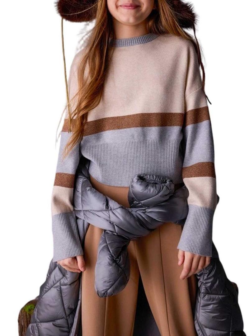 Camisola Mayoral. Modelo metalizado. Cor azul, bege e marrom. Contém poliéster reciclado. Comprimento cropped. Extremidades caneladas. Gola redonda. Confeccionados com fios metalizados.