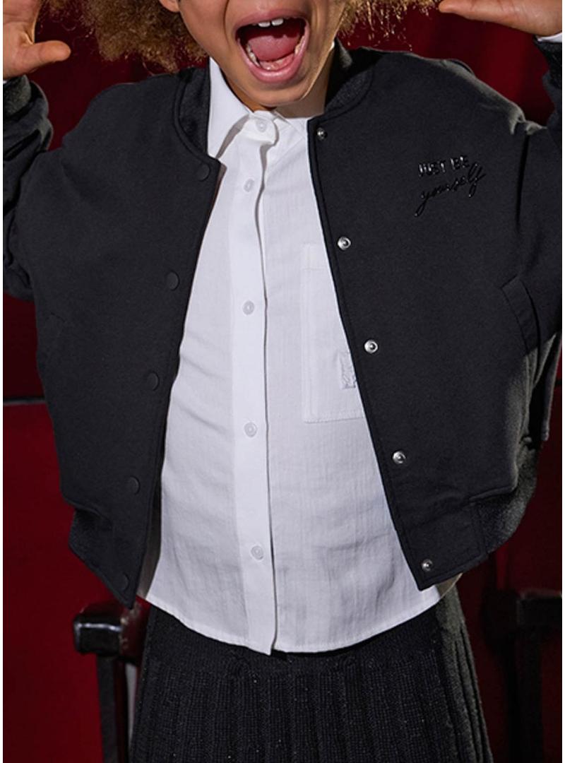 Jaqueta Mayoral. Modelo Bomber. Cor preta. Fecho com botões de pressão na parte da frente. Bolsos na frente. Mensagem em relevo no peito. Gola e extremidades caneladas.
