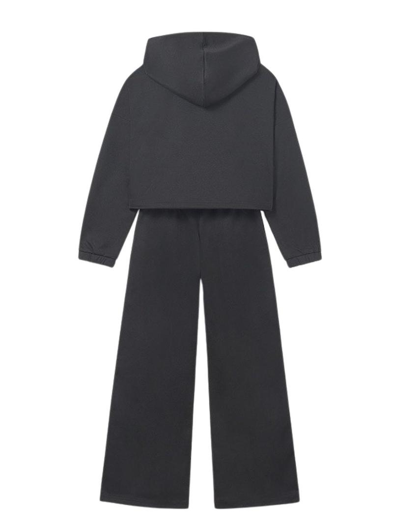 Conjunto de fato de treino Mayoral. Modelo com faixas esportivas. Cor preta. Moletom de corte folgado. Gola com capuz. Barra com elástico ajustável. Calça comprida. Perna larga. Aberturas com botões de pressão. Cintura elástica.