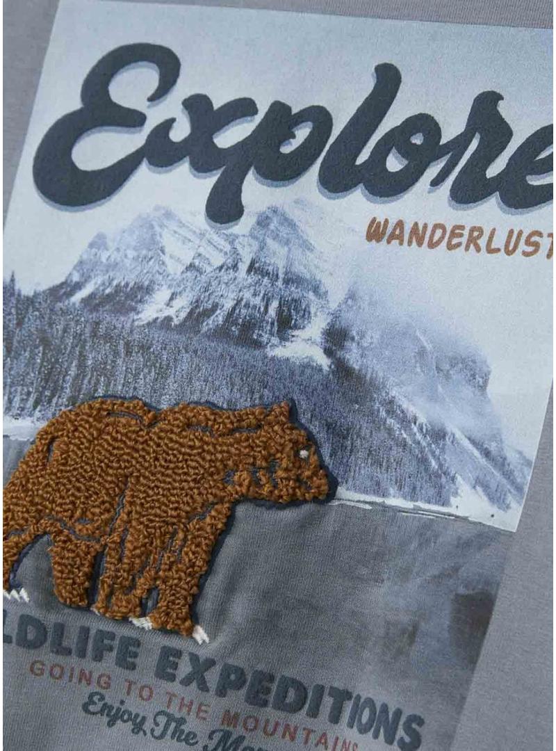 Moletom Name It. Modelo Moran. Cor azul. Gola redonda. Extremidades caneladas. Ajuste regular. Ilustração Explorer estampada na frente. Detalhe de urso em relevo.