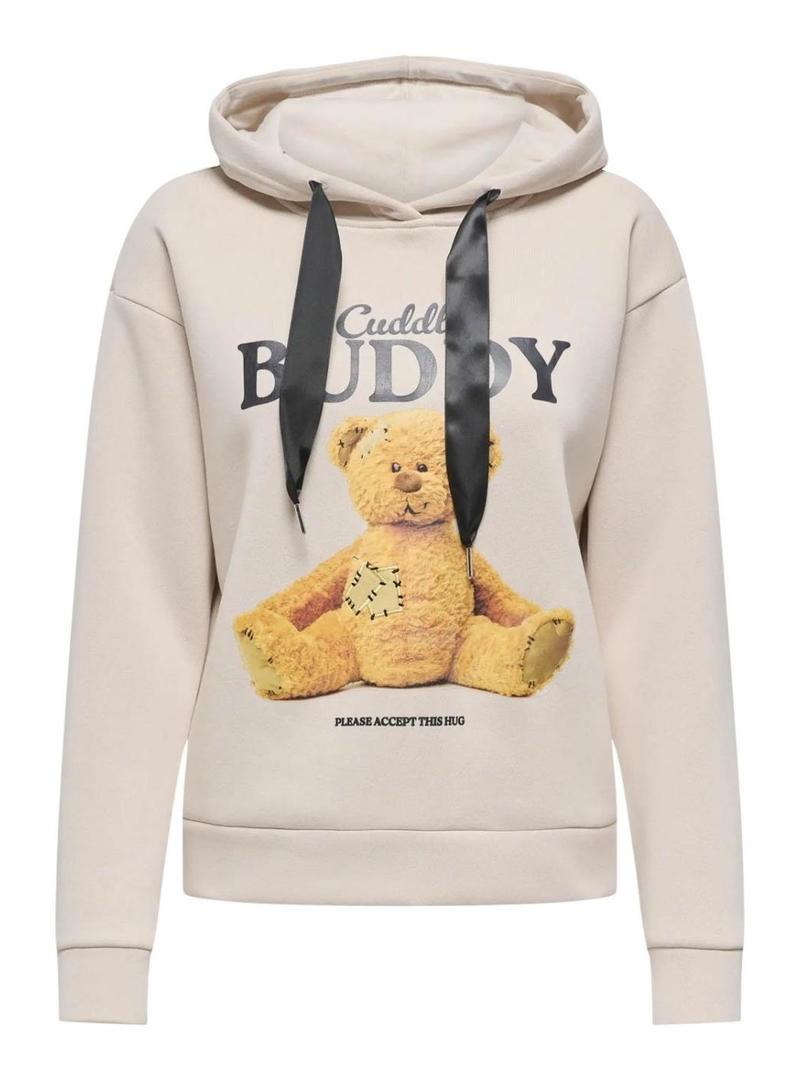 Moletom Only. Cor beige. Com capuz com laços em contraste. Estampa de urso no peito e nas costas. Manga comprida. Corte regular. Ombros caídos. O modelo veste tamanho S.