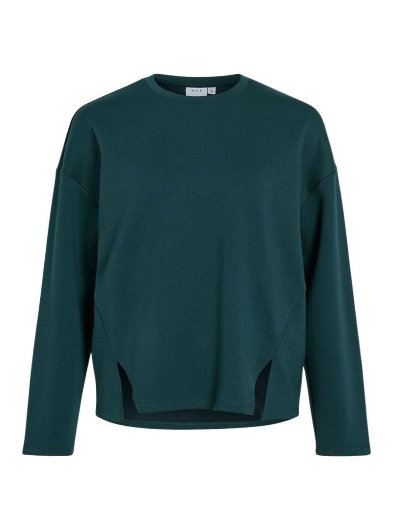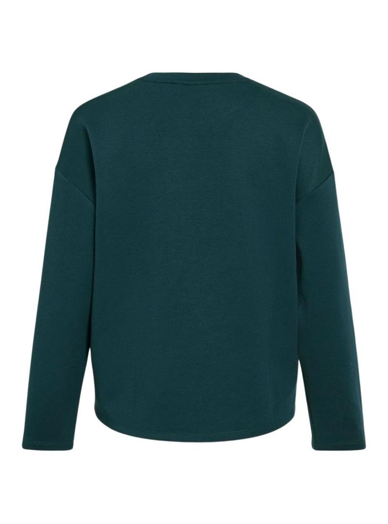 Moletom Vila. Cor verde. Manga comprida. Gola redonda. Ombros caídos. Detalhes de aberturas na parte da frente. Tecido macio. Formato regular. O modelo veste o tamanho S.
