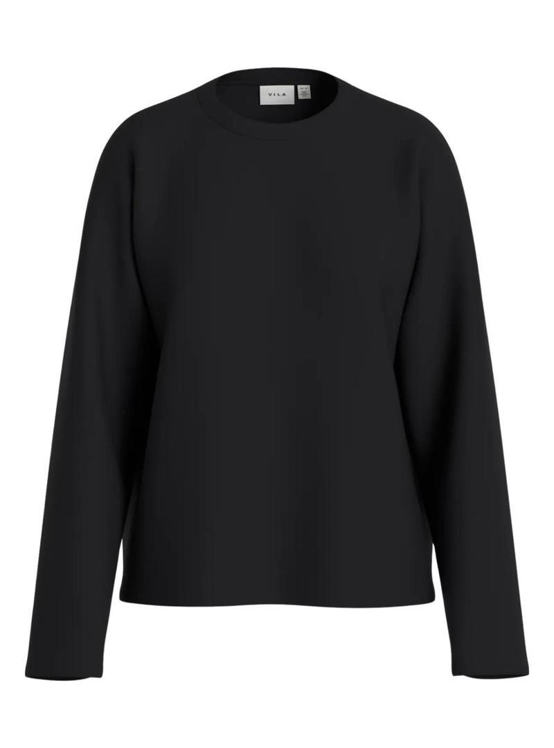 Moletom Vila. Cor preta. Manga comprida. Gola redonda. Ombros caídos. Detalhes de aberturas. Tecido suave. Corte regular. A modelo veste o tamanho S.