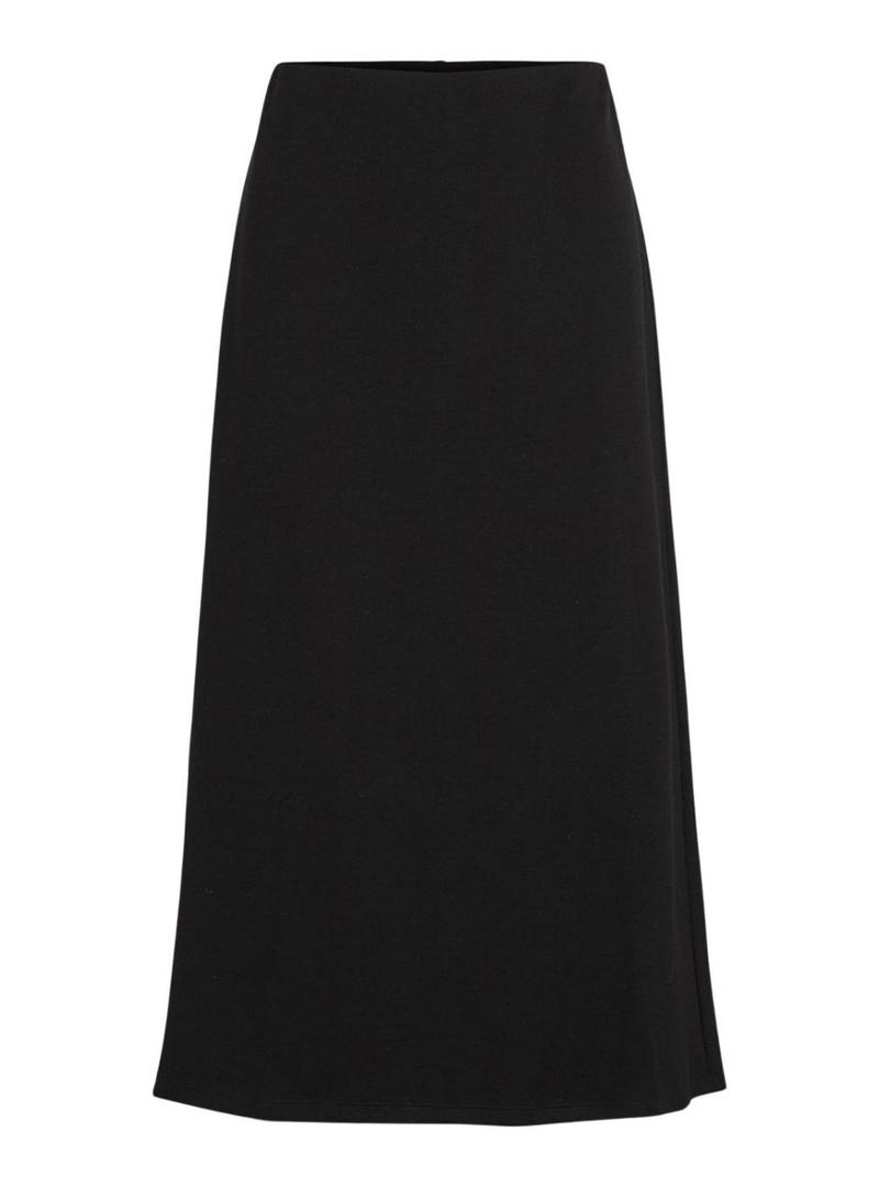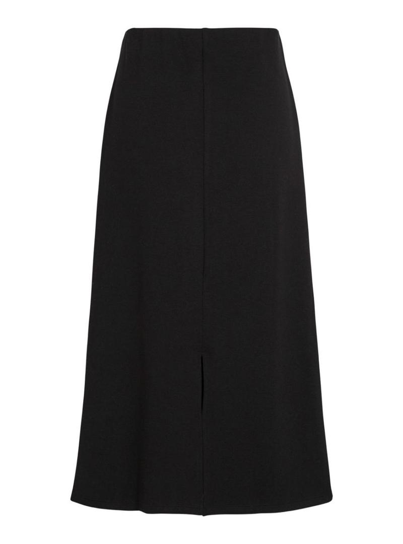 Saia Vila. Cor preta. Cintura alta. Abertura na parte de trás. Cintura elástica. Tecido macio. Formato regular. A modelo está usando o tamanho S.
