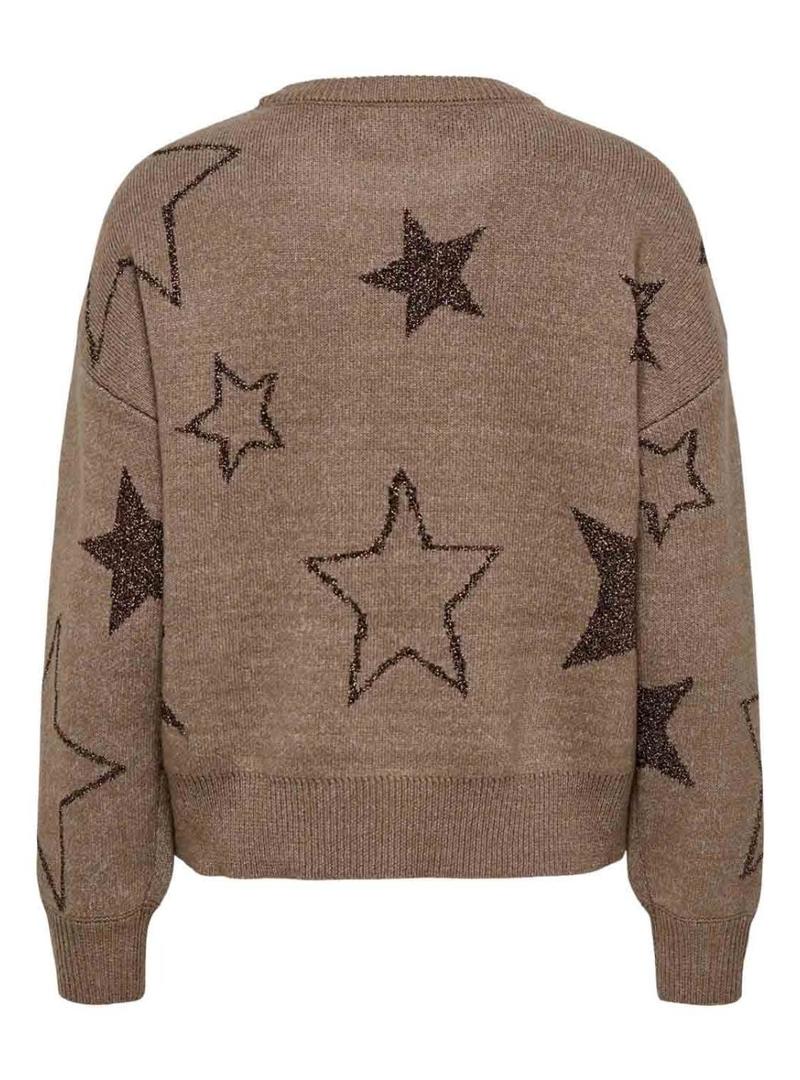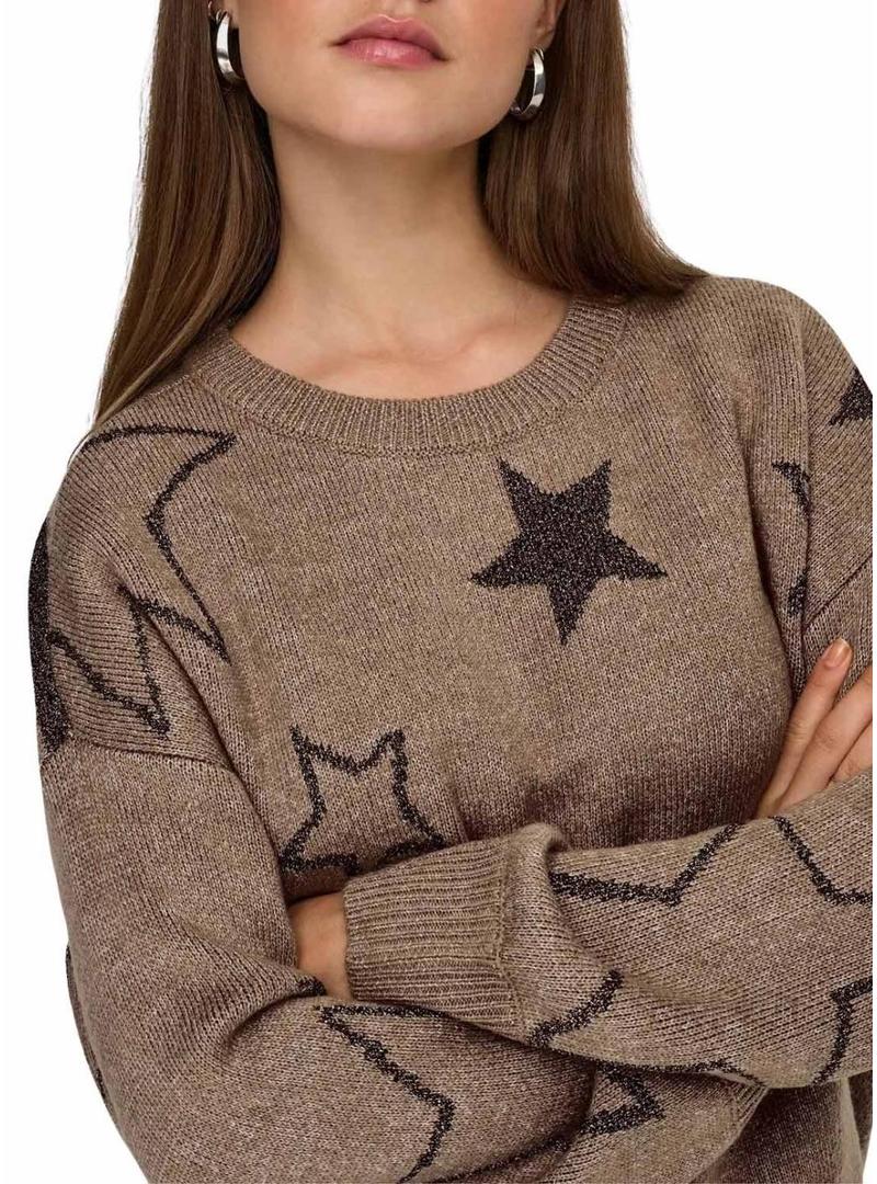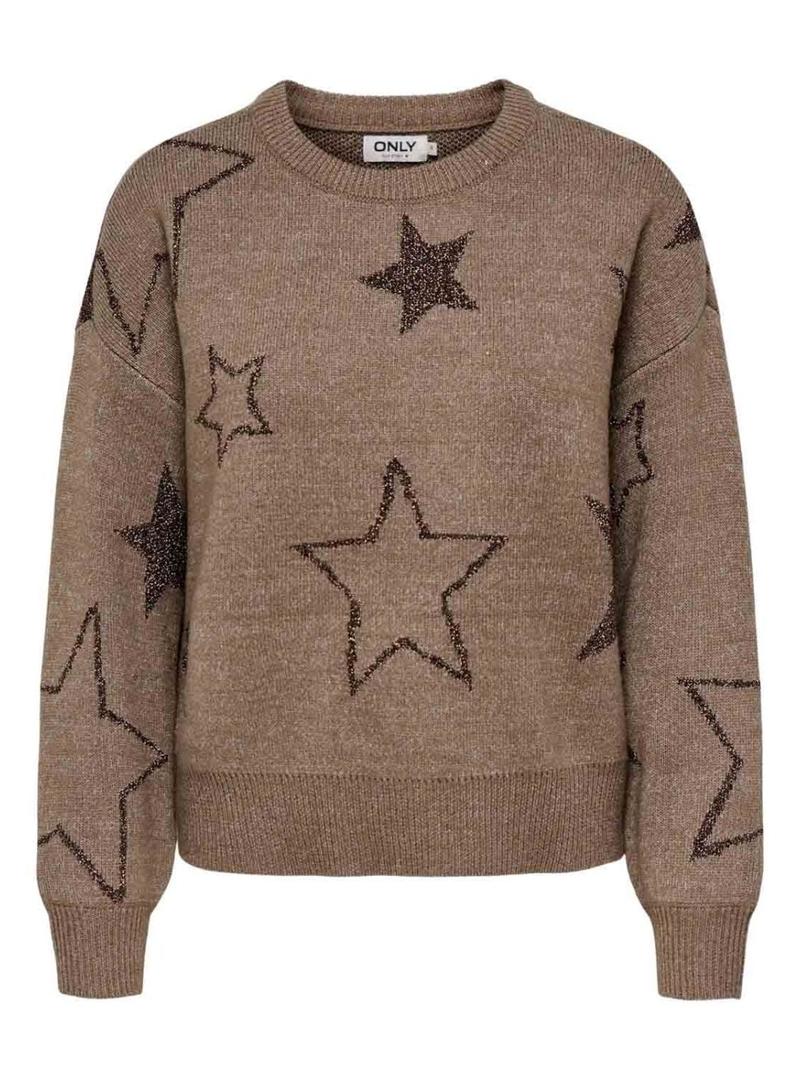 Camisola Only. Gola redonda. Mangas compridas. Cor tostado. Ombros caídos. Acabamentos canelados. Estampa de estrelas com glitter. Formato regular. O modelo veste tamanho S.
