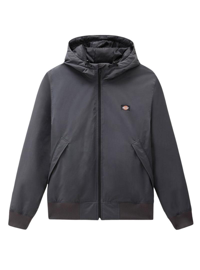 Jaqueta Dickies. Modelo Sarpy. Cor cinza. Fechamento frontal com zíper. Tecido resistente à água. Bolsos laterais. Um bolso interno. Logotipo da marca no peito. Com capuz. Corte reto. Bainha com elástico.