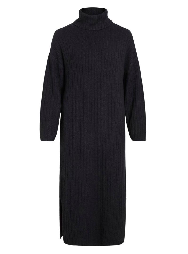 Vestido Vila. Cor preta. Comprimento midi. Tecido de malha canelada macia. Manga comprida. Gola alta. Ombros caídos. Aberturas laterais. Corte regular.
