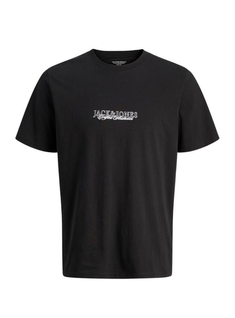 Camiseta Jack and Jones. Modelo Bleecker. Cor preto. Gola redonda. Manga curta. Ajuste regular. Logotipo estampado no peito. Detalhes em branco.