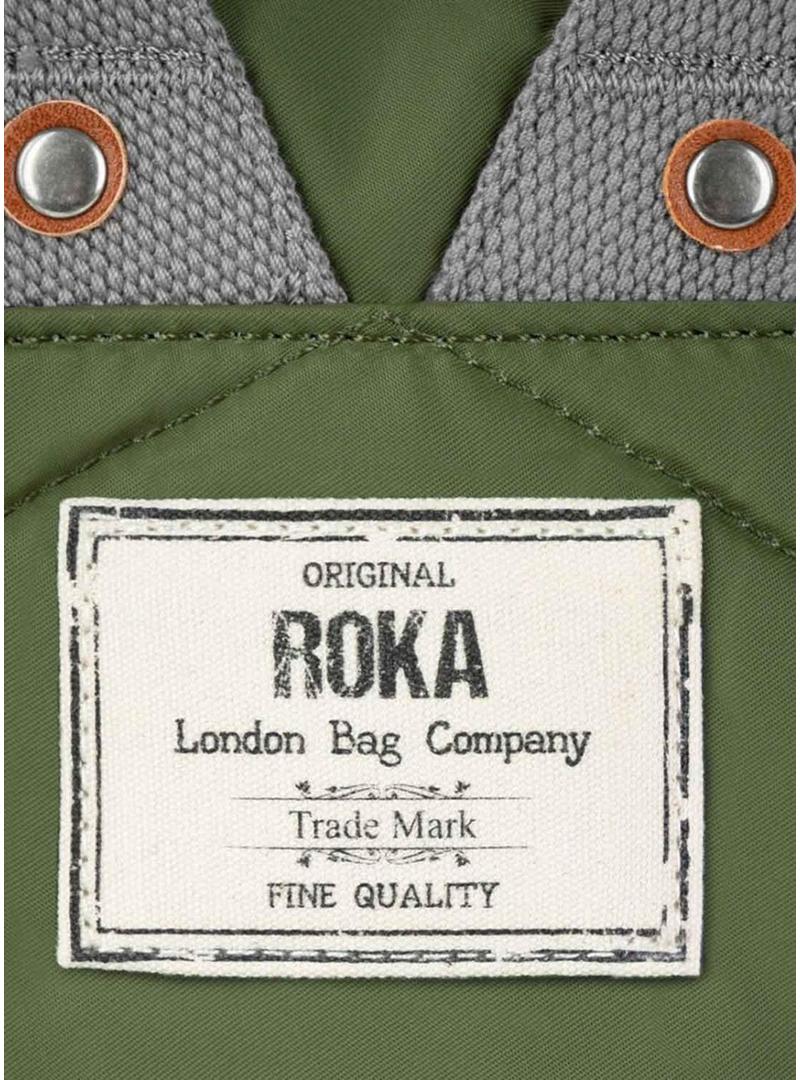 Mochila Roka. Modelo Canfield. Cor verde. Tamanho médio. Fecho enrolável. Abertura ampla. Zíper grosso. Suportes magnéticos. Puxadores de zíper coloridos em contraste. Possui um bolso secreto externo com fecho de zíper. Bolsos internos. Material exterior: Lona reciclada resistente às intempéries. Bolsos laterais para garrafas. Alças de ombro ajustáveis, conforto V-Factor. Alças largas. Tamanho: 42 cm x 30 cm x 12 cm. Capacidade: 15 litros. Vegano. Ideal para guardar um laptop de 15'.