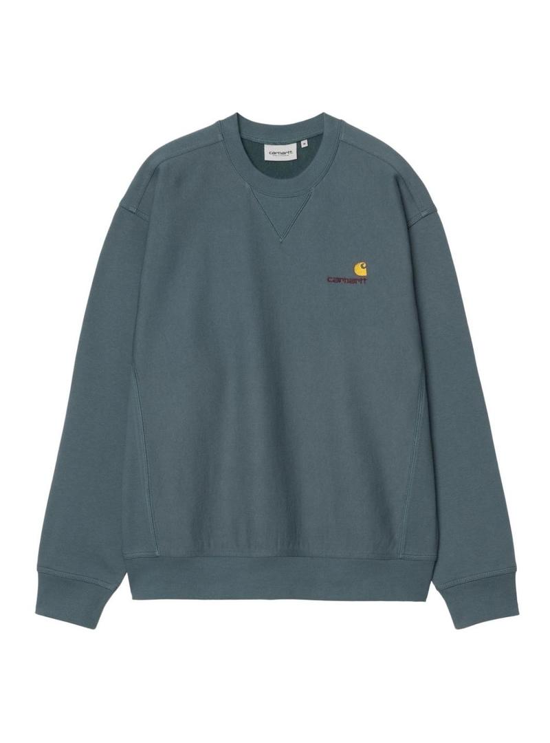 Camisola Carhartt. Modelo American Script. Cor azul. Gola redonda canelada. Feita com uma mistura de algodão e poliéster penteados. Silhueta ampla e folgada. Logotipo bordado no peito. Detalhes bordados sutis. Bordado americano.