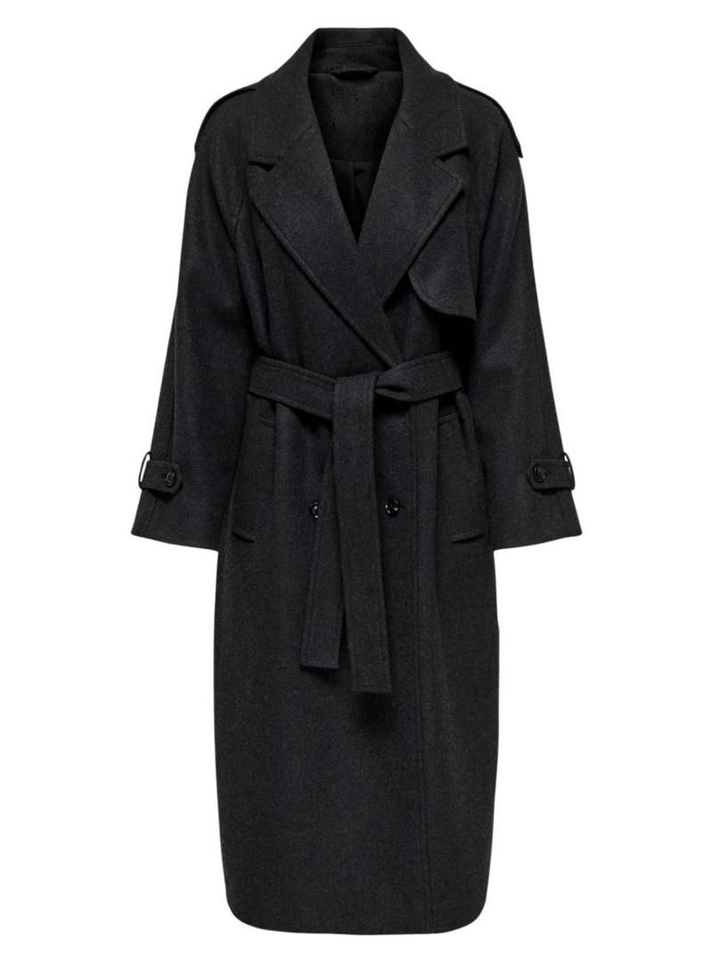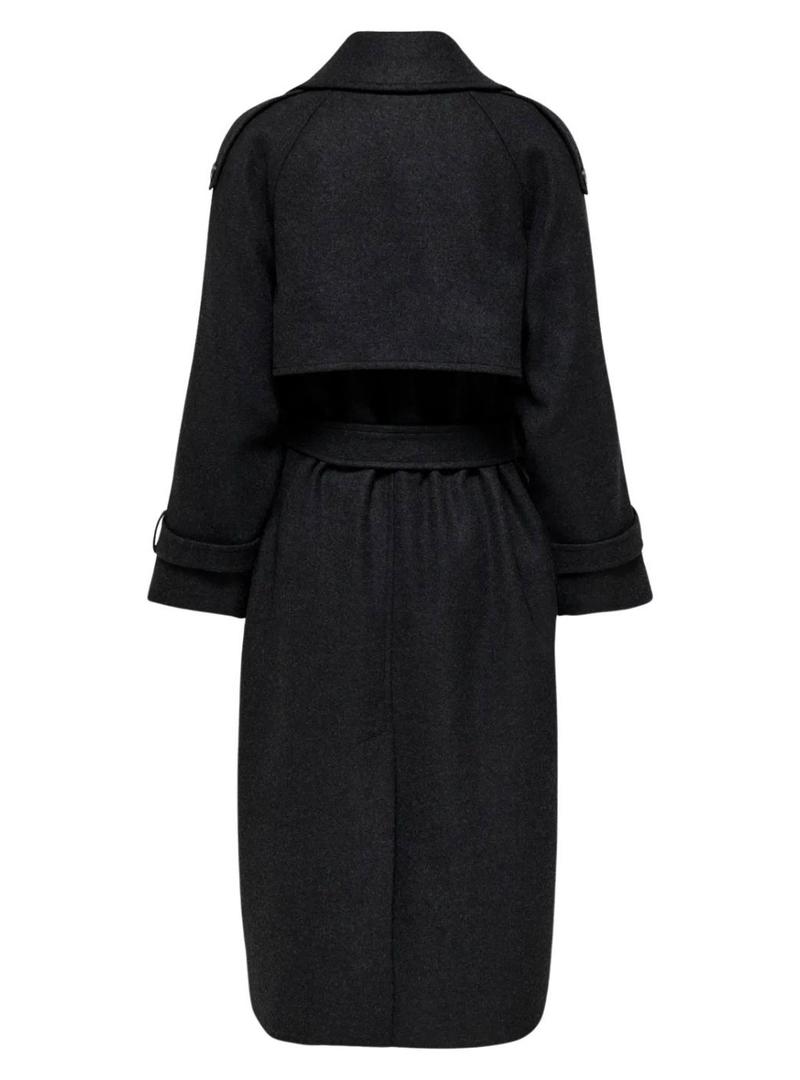 Casaco Only. Modelo Dear. Cor preta. Fechamento de botões cruzados. Ajuste folgado. Cinto autoamarrado na mesma cor. Bolsos laterais. Comprimento abaixo dos joelhos.