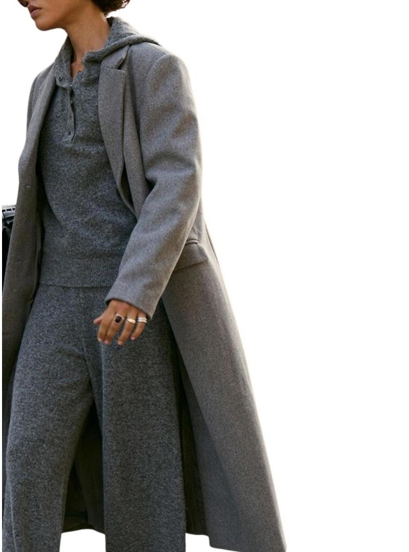 Casaco Vila. Modelo Visolo. Cor cinza. Corte reto. Fechamento com três botões. Bolsos laterais com aba. Ajuste regular.