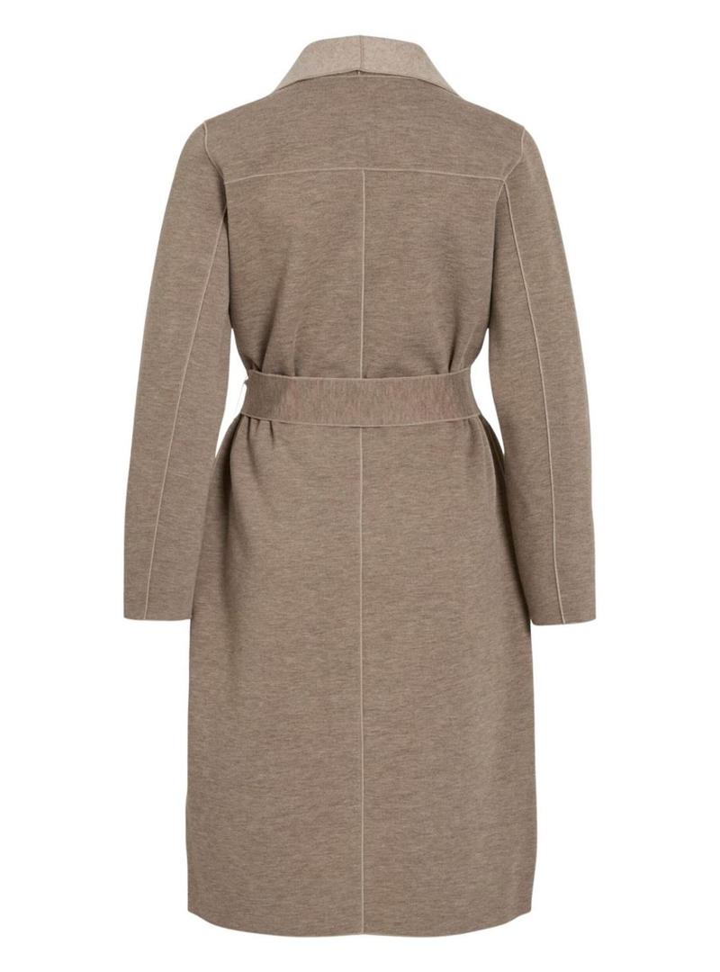 Casaco Vila. Modelo Juice. Cor bege. Fechamento cruzado sem botões. Cinto auto amarrado. Bolsos laterais. Tecido suave e compacto.