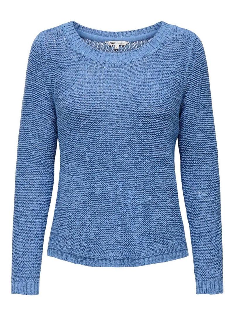 Camisola Only. Modelo Geena. Cor azul. Decote redondo amplo. Manga comprida. Extremidades caneladas. Ajuste regular. Tecido de malha plana.
