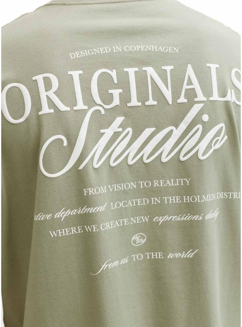 Camiseta Jack and Jones. Modelo Norrebro. Cor verde salva. Gola redonda. Manga curta. Ajuste folgado. Mensagem estampada no peito e nas costas com estilo vintage. Etiqueta da marca na lateral.