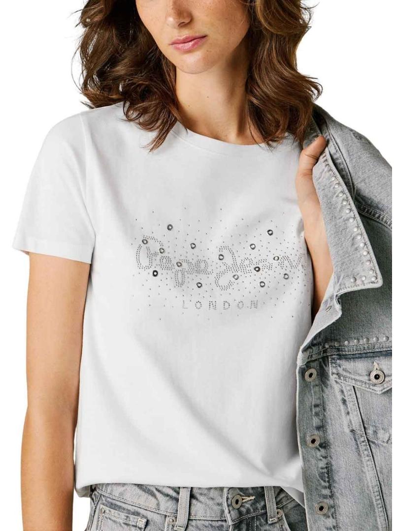 Camiseta Pepe Jeans. Modelo Brady. Cor branca. Gola redonda. Manga curta. Ajuste regular. Logotipo em metal no peito. Tachas e brilhantes decorativos em prateado.