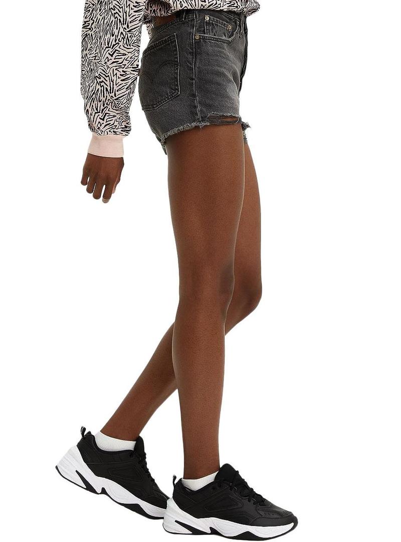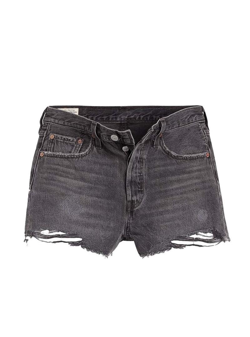 Short Levis. Modelo 501 Original. Cor cinzenta. 5 bolsos. Fecho de botão e zíper. Remendo da marca nas costas. Detalhes quebrados. Extra curto.